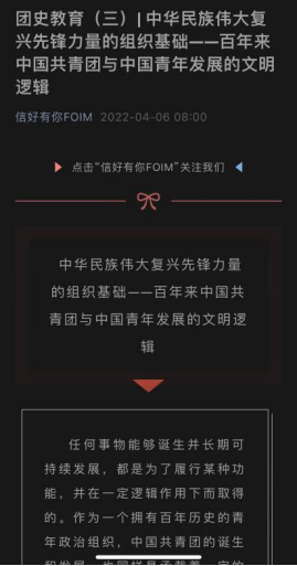 凝聚奋进力量,牢筑信仰之基。永利3044集团官网团委面向青年员工广泛开展团史学习教育,在公司公众号“信好有你FOIM”上开辟“团史教育”专栏,推进理论学习入脑入心,引导青年学史知史,爱团爱党,赓续红色血脉,唱响“请党放心,强国有我”最强音。
