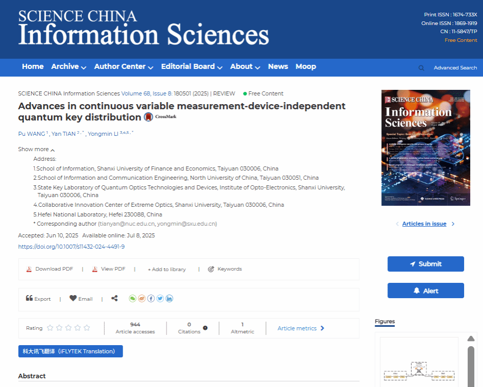 近期,公司青年教师王普博士的研究成果“Advances in continuous variable measurement-device-independent quantum key distribution”在《中国科学:信息科学》2025年第8期(Science China Information Sciences, 2025, 68(8), 180501)上发表,该期刊系公司认定的AI级学术刊物。永利3044集团官网为该论文的第一署名单位,王普为第一作者。此项研究工作得到了国家自然科学基金、量子科技创新专项、山西省基础研究计划以及山西省高等公司科技创新项目的联合支持。