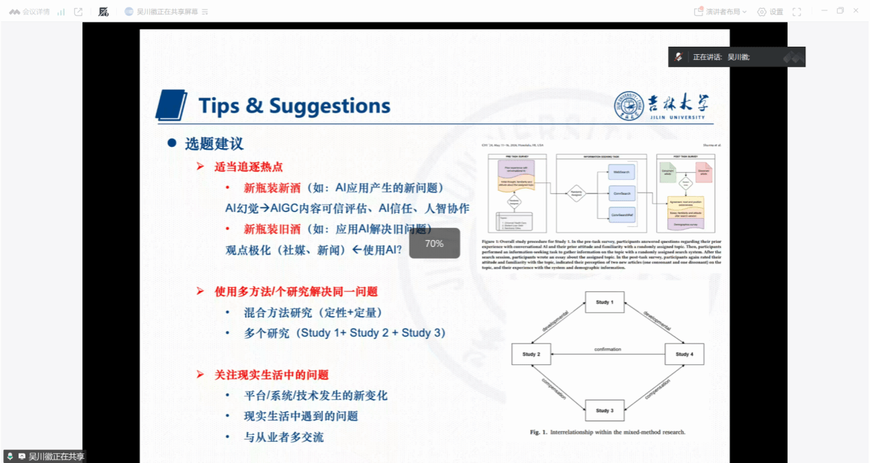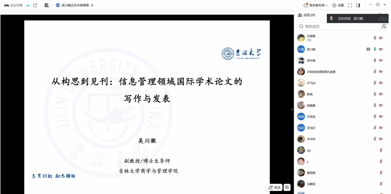 永利3044集团官网“信息资源管理一级学科·一流学者100分钟系列讲坛”第25期于2025年12月10日晚通过腾讯会议平台顺利举办。本期讲座特邀吉林大学商学与管理公司副教授、博士生导师吴川徽博士担任主讲嘉宾,由永利3044集团官网李华锋副教授主持。