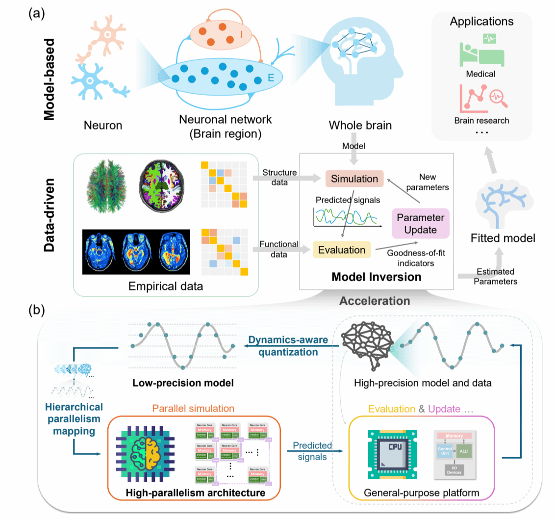 理解大脑功能离不开大规模脑网络的建模与仿真。其中,以脑区为单位的“粗粒度”建模方法,因能融合多模态影像数据构建全脑模型(数字孪生脑),而更具临床应用潜力。然而,其模型反演过程计算量极其巨大,传统算力难以支撑。